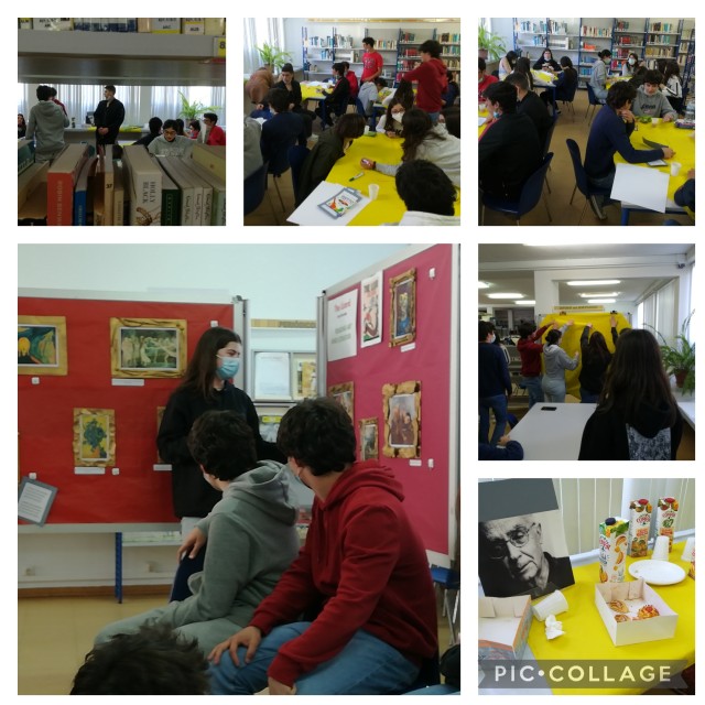 Como motivação para o tema seguinte da disciplina, o 11º2 veio à biblioteca ter uma aula especial de Filosofia. Num primeiro momento, os alunos, confortavelmente sentados, uns nos cadeirões e outros sobre as almofadas no chão, ouviram a leitura de O LAGARTO. Seguidamente, os alunos da turma foram desafiados, um a um, a associar excertos da obra a alguns quadros de pintores famosos e a se expressarem livremente sobre essas conexões entre as duas formas de arte. Num segundo momento, igualmente a partir de excertos selecionados da obra, colocaram questões,em jeito de mapas mentais, no método de world café. A partilha foi extraordinária. E as bolachinhas que as professoras levaram também!!!!