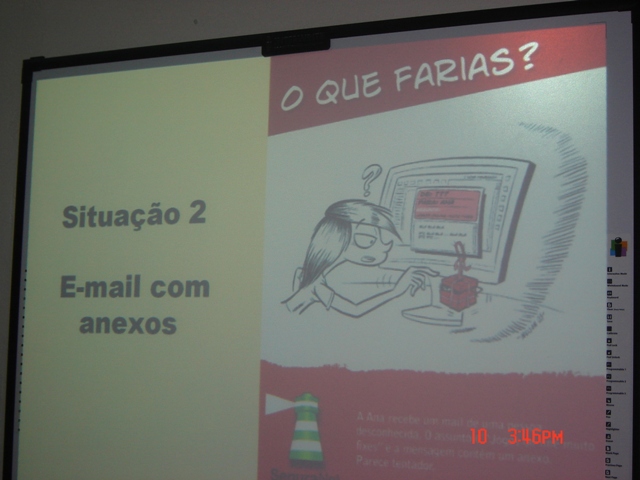Estas e outras situações foram colocadas a diferentes alunos que participaram em sessões sobre "Internet: Oportunidades e Riscos", dinamizadas pela equipa do Projecto Liga-te e pelo Professor José Fernandes, preocupados com a segurança dos adolescentes e jovens da nossa escola perante a astúcia dos que se entretêm a instalar software malicioso nos computadores ou a obter indevidamente informações pessoais e dados sigilosos.
